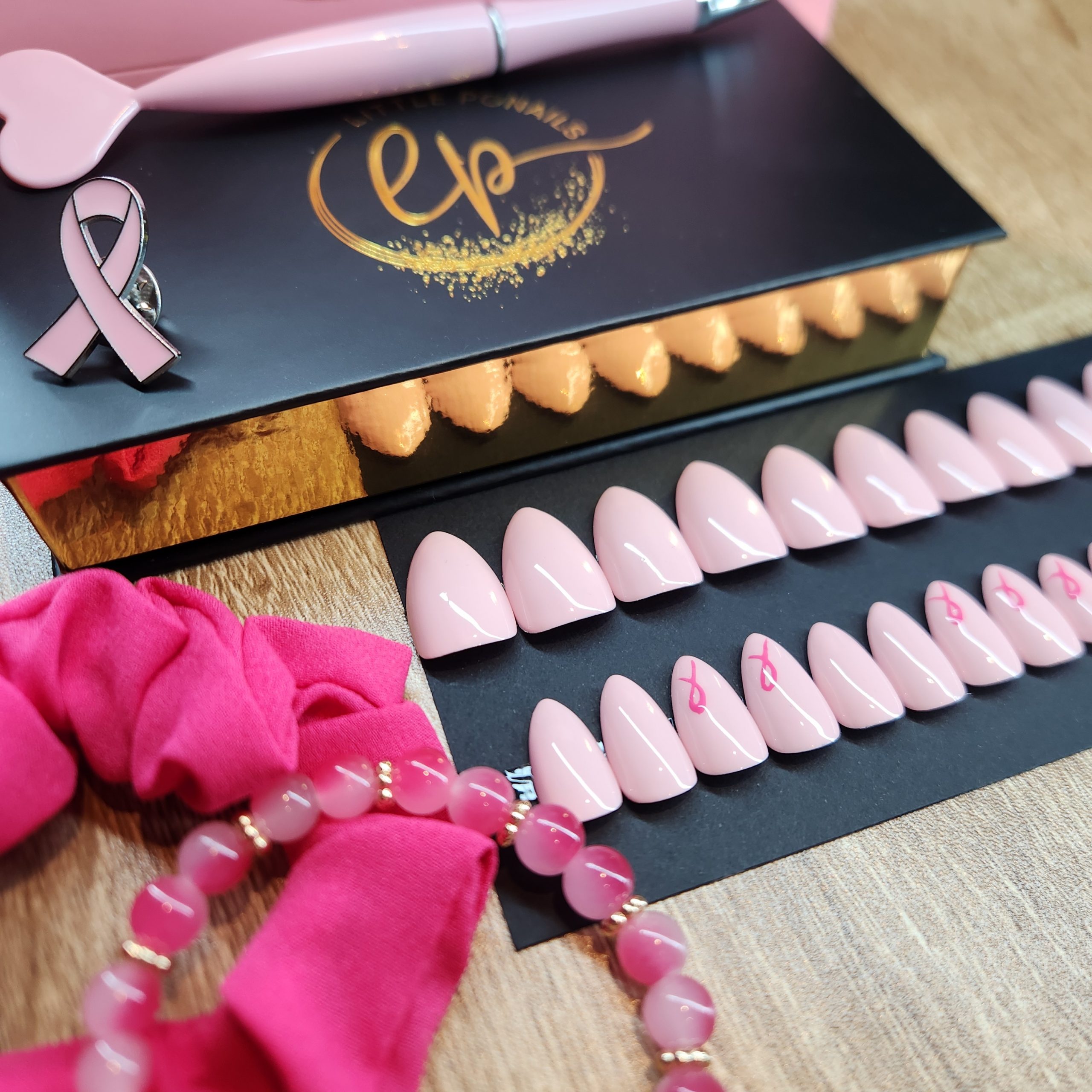 – Votre Magnifique Little Coffret Octobre Rose de 24 capsules faits main, 1 Little notice pour une pose facile ainsi qu’un kit de préparation des ongles.